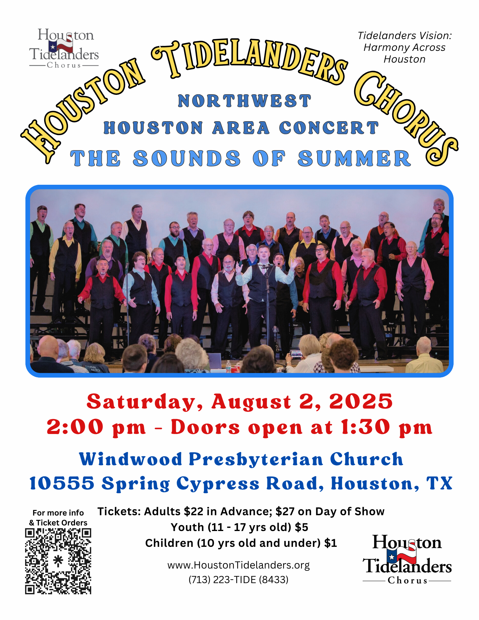 The Houston Tidelanders are a premier a cappella chorus rooted in the heart of Houston, Texas, with a rich legacy spanning over 75 years. We’re known for our vibrant barbershop style—featuring tight harmonies, resonant chords, and shimmering overtones that bring every performance to life.